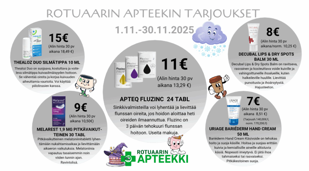 Tarjouksemme marraskuussa auttaa varustautumaan flunssaan ja viileän ilman aiheuttamiin kuivuusoireisiin. Thealoz Duo silmätipat kosteuttavat viiman kuivattamia silmiä. Apteq Fluzinc lyhentää flunssan kestoa ja lievittää oireita. Decubal Lips&Dry Spots balm kosteuttaa ja ravitsee kuivia ja vahingoittuneita ihoalueita. Uriage Bariéderm Hand Cream hoitaa tehokkaasti kuivia käsiä. Melarest pitkävaikutteinen melatoniini auttaa tasaisesti nukkumista.